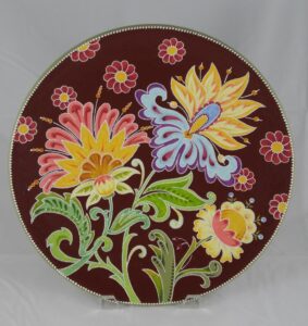 Using fired bisque as her canvas, Barken combines a variety of glaze techniques to create a tactile quality for each painted piece. Tiny dots are her signature detail. Some bisque pieces are redefined by cutting, grinding, layering and combining with found objects and copper and brass.