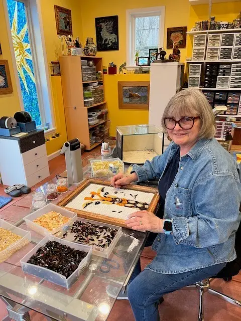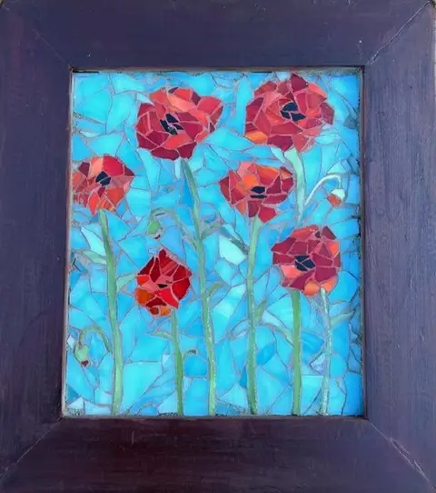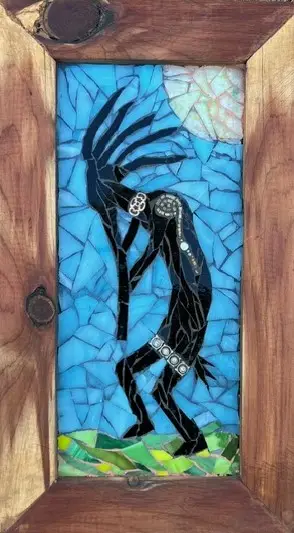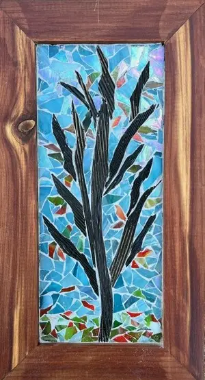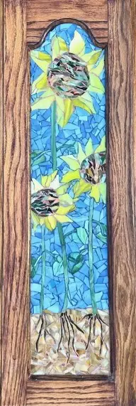 I have been creating mosaics for 20 years, but I’ve loved making things my whole life. I’m mainly self-taught, but, early on I was awarded an Emerging Art Grant which allowed me to mentor with a very well known mosaic artist, Cassie Edmonds. I’ve displayed my art in galleries and art shows in Kansas, Minnesota, Texas and Missouri. My mosaic suns have appeared on CBS Sunday Morning as transition pieces seven times, with one of my mosaics making the producer’s top 32 (as documented in the article “Here Comes the Sun.”) I love creating mosaics from my own photos, as well as making abstract pieces. I especially enjoy sharing my love of mosaics through teaching classes. I have worked over the years in a small basement room, to various rooms I’ve taken over in our houses, to, currently, an actual studio we had built in our backyard. I Love Mosaics!